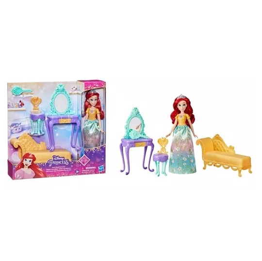 Ariel se prepara en su tocador para una gran celebración. Inspirado en la película de Disney La sirenita, este set incluye una muñeca de Ariel vestida con una falda de tela, un toque diferente a su estilo icónico de la película. Completa el look de Ariel con la diadema y los zapatos, y peina su cabello con el cepillo incluido. El cajón del tocador se abre y se cierra. Obsequia esta dulce muñeca Disney Princess como regalo de cumpleaños o de Navidad a quienes adoran La sirenita y las princesas Disney. Edad: a partir de 3 años.