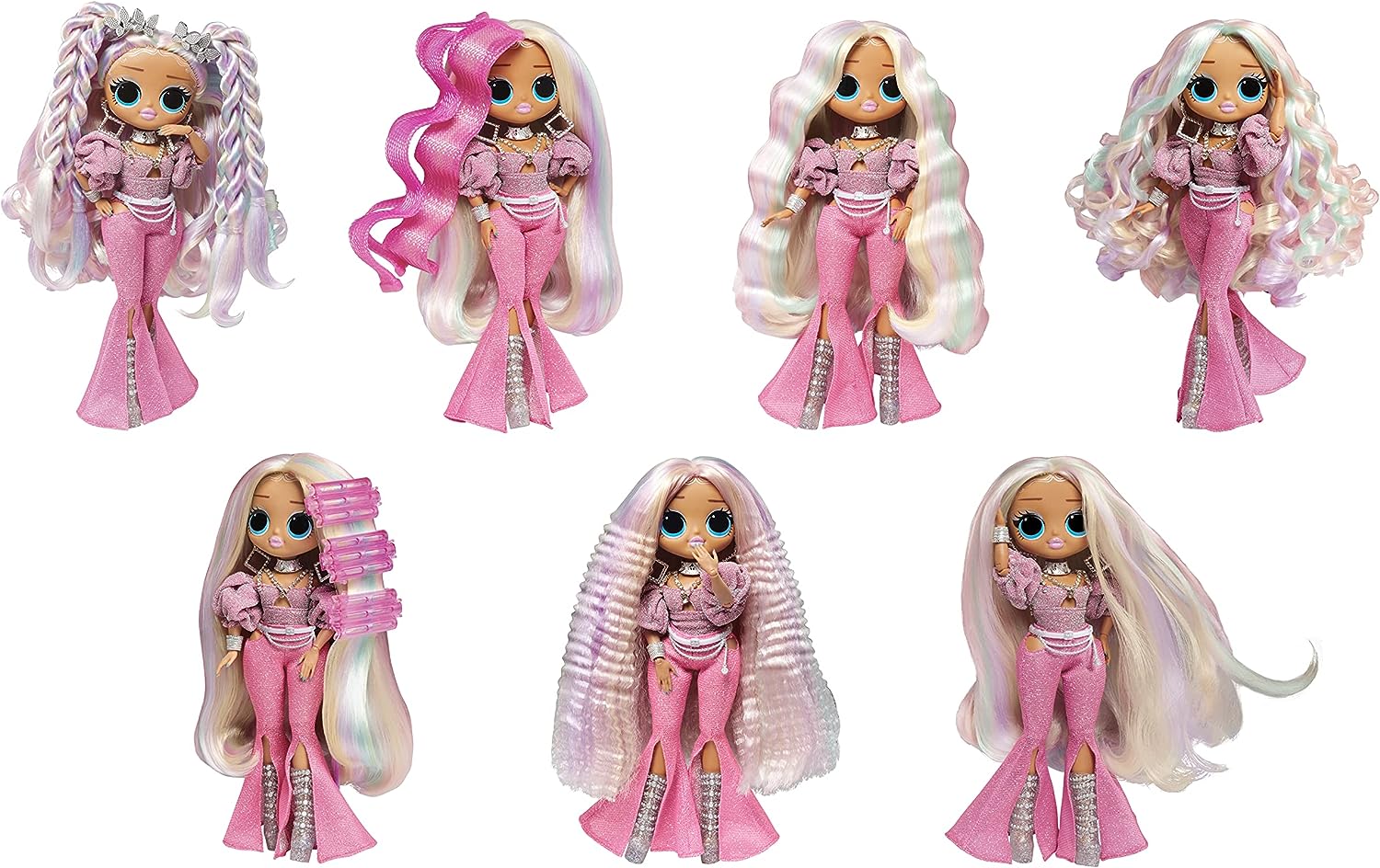 - Incluye:1 muñeca LOL Surprise OMG Fashion Show Hair Edition, traje de moda, aretes, puño de anillo de diamante, zapatos, tonos glamurosos, gargantilla con joyas, cinturón, elásticos para el cabello transparentes, pasadores de engaste, ballie de pelo de cristal, pinza de pelo de gema, rizador de pelo de ondas de playa, combinación de cepillo/peine, W.O.W. Magic Mousse y revista.