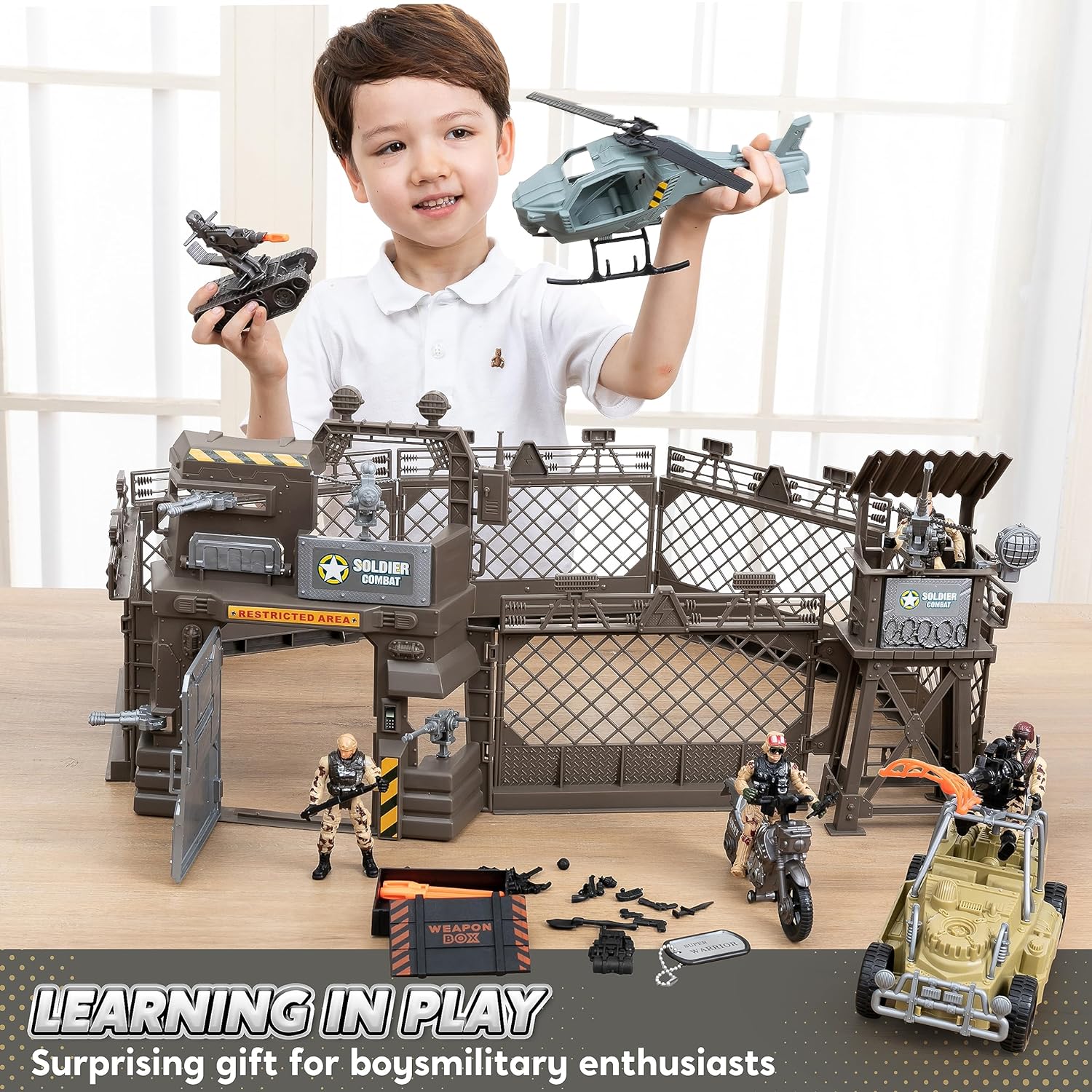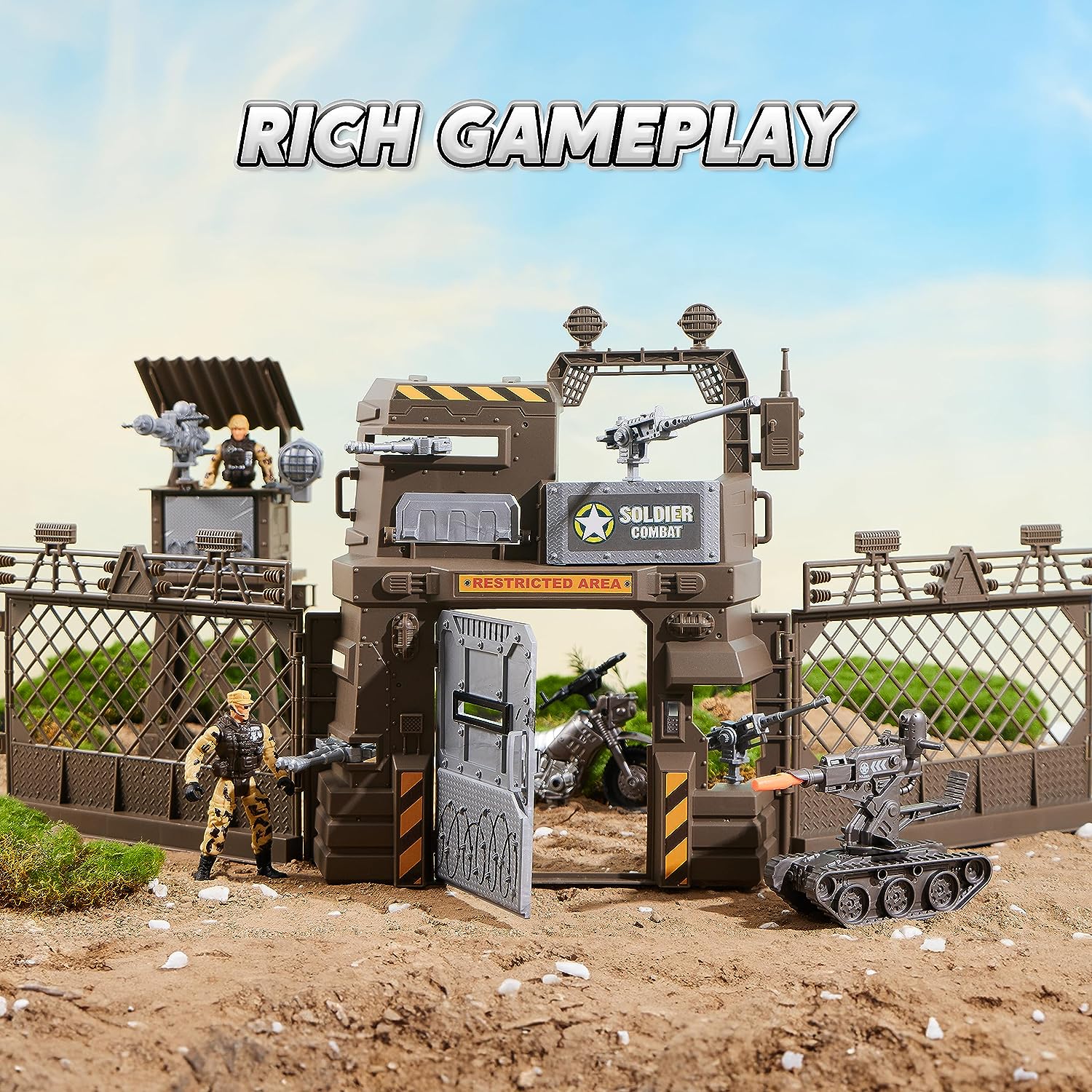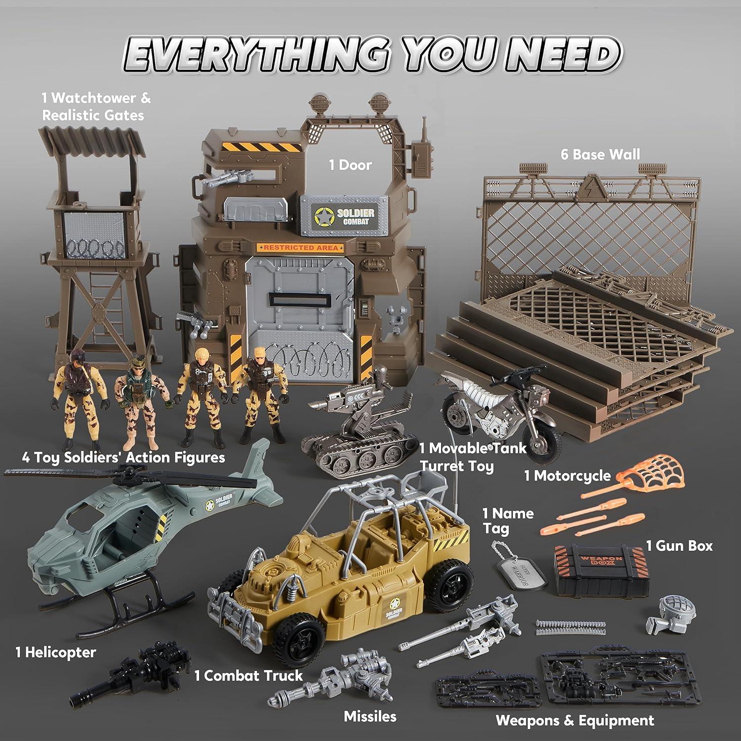 - Nuestro juego completo de juguetes de base militar incluye 1 puerta, 1 torre de vigilancia y puertas realistas, 1 helicóptero, 1 camión de combate, 1 juguete de torreta de tanque móvil, 1 motocicleta, 4 figuras de acción de soldados de juguete, misiles y red en 1 caja de armas, varias armas y equipo, 1 etiqueta de nombre.